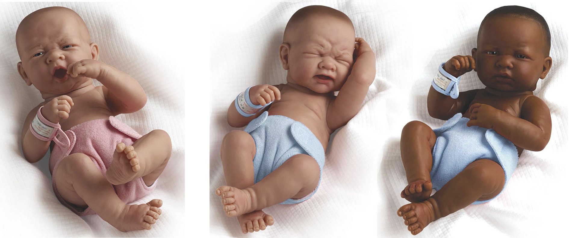 Los tres siguientes pequeños escogidos pertenecen a la categoría La Newborn –que se encuentra dentro de la línea Berenguer Boutique-. Estos bebés son los de más corta edad de todos los que os hemos mostrado. Si sois hábiles observando, os habréis percatado de este dato gracias a las pulseras identificativas que llevan estos bebés –propias de los hospitales en los que ven por primera vez la vida toda criatura que nace-. Lo interesante aquí, sin embargo, son la variedad de expresiones y razas que brinda JC Toys al público. Encontramos -bajo estas líneas- tres diferentes, siendo indistinto el sexo del nacido.
